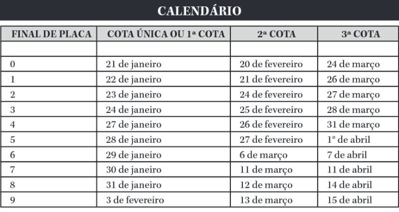 Os vencimentos do IPVA 2025 começam no próximo dia 21 de janeiro. Os contribuintes podem optar pelo pagamento em: