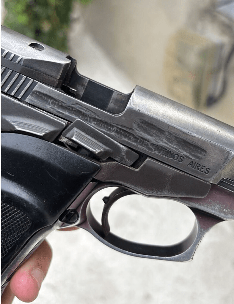 Durante a ação, os agentes encontraram uma réplica de fuzil, três simulacros de pistola, um rifle calibre .22, uma pistola verdadeira e porções de drogas. Entre os itens recolhidos, um detalhe chamou a atenção: a pistola trazia a inscrição “Policía de la Provincia de Buenos Aires”, levantando a suspeita de que o armamento possa ter origem argentina.