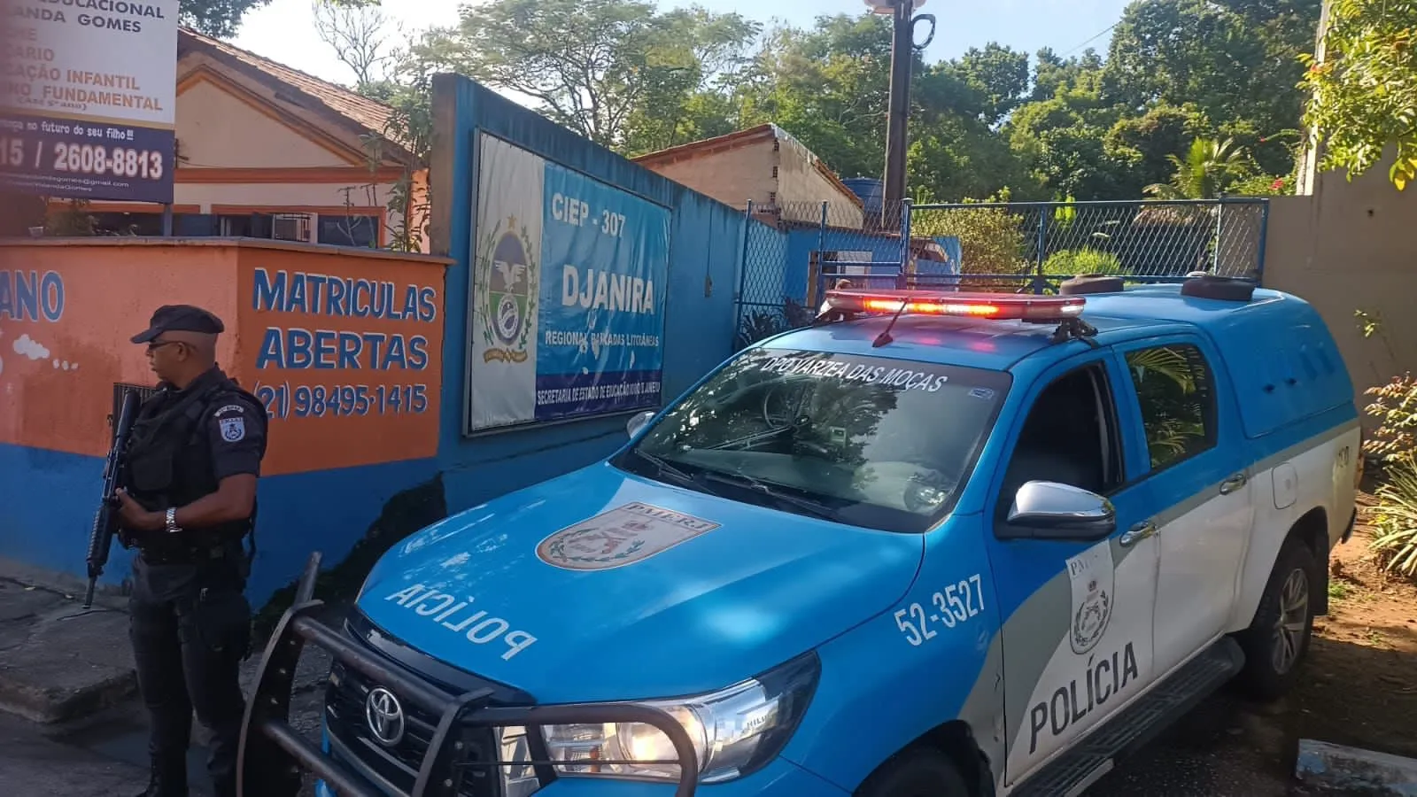 Uma viatura foi posicionada em frente ao Colégio Santos Dias, em Neves
